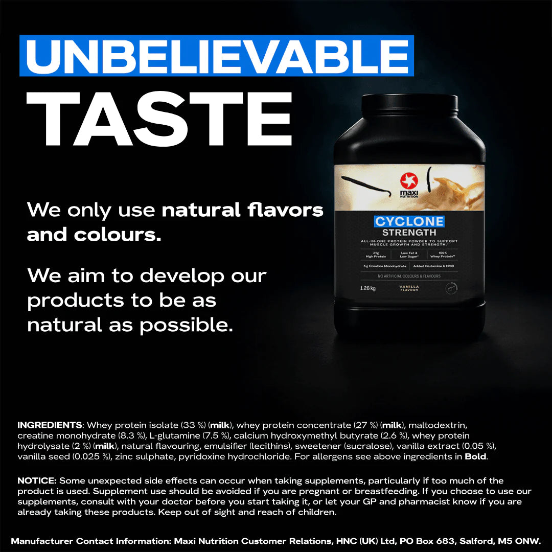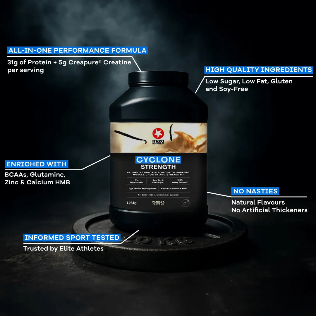MaxiNutrition Cyclone to zaufany w Wielkiej Brytanii suplement białkowy z kreatyną, zaprojektowany naukowo, aby wspierać wzrost mięśni, szybszą regenerację i lepszą wydajność sportową. Niezależnie od tego, czy jesteś sportowcem, bywalcem siłowni czy poważnym zawodnikiem – Cyclone dostarcza wszystkiego, czego potrzebuje Twój organizm po treningu, w jednej wygodnej formule.